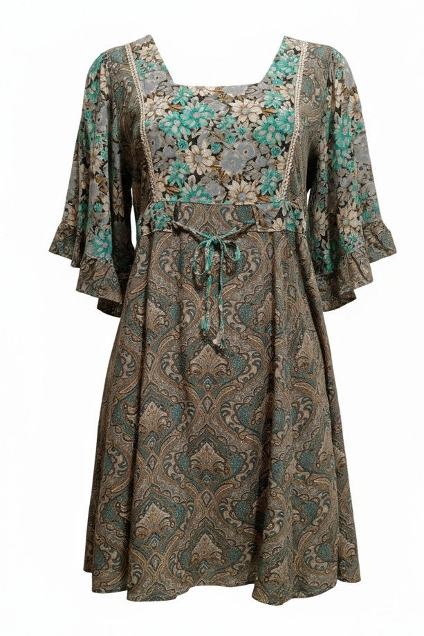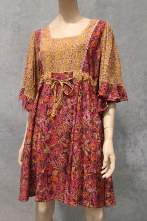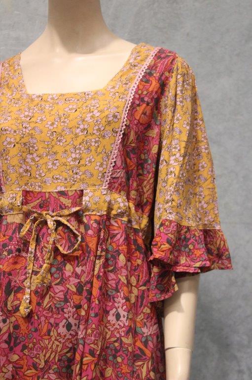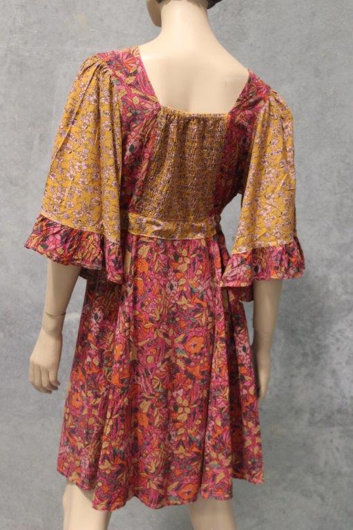A great festival dress here in gorgeous soft flowing rayon florals with dramatic sleeves and ruffle detailing
